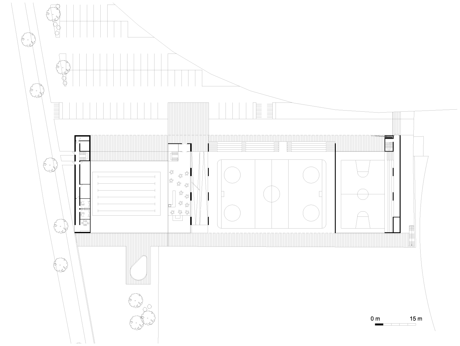 Implanté parallèlement à la pente et aux terrains de sport existants, le projet propose de regrouper l’ensemble