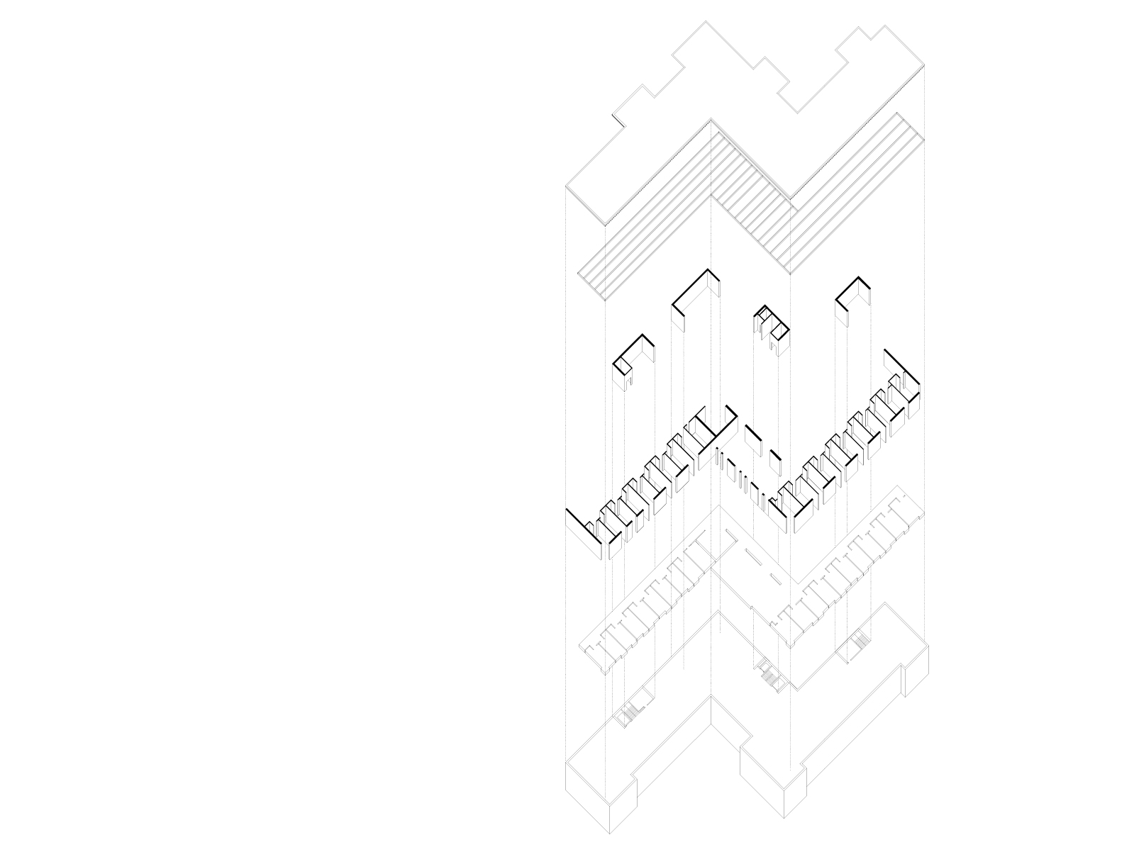 Le programme de la nouvelle unité se superpose au dernier étage et se caractérise par trois bandes, les chambres/séjour tournées vers le sud/sud-ouest, un couloir au centre et un jardin suspendu longe le couloir et devient un espace extérieur protégé. Elargissement visuel du couloir, pour des rencontres, des pauses et détentes extérieures plus intimes.