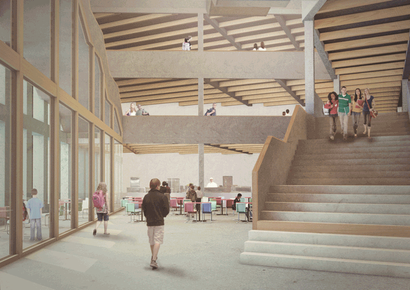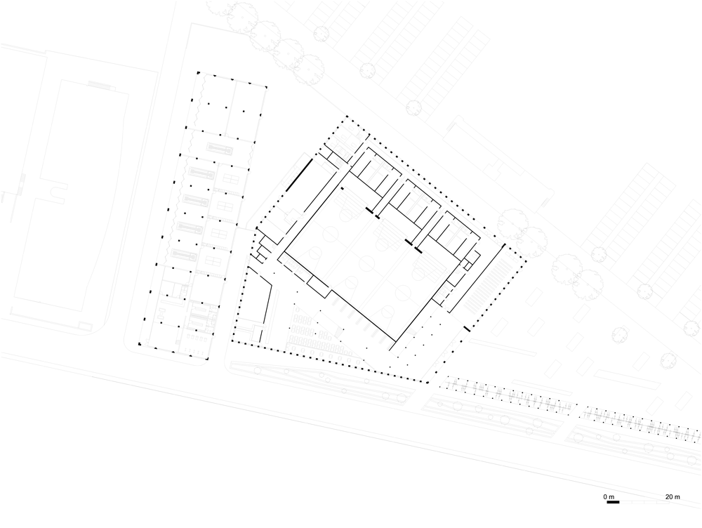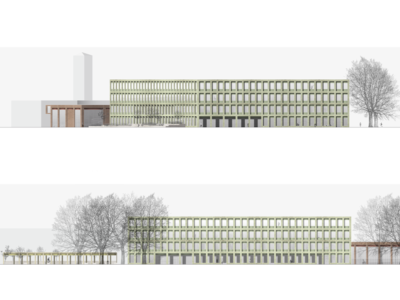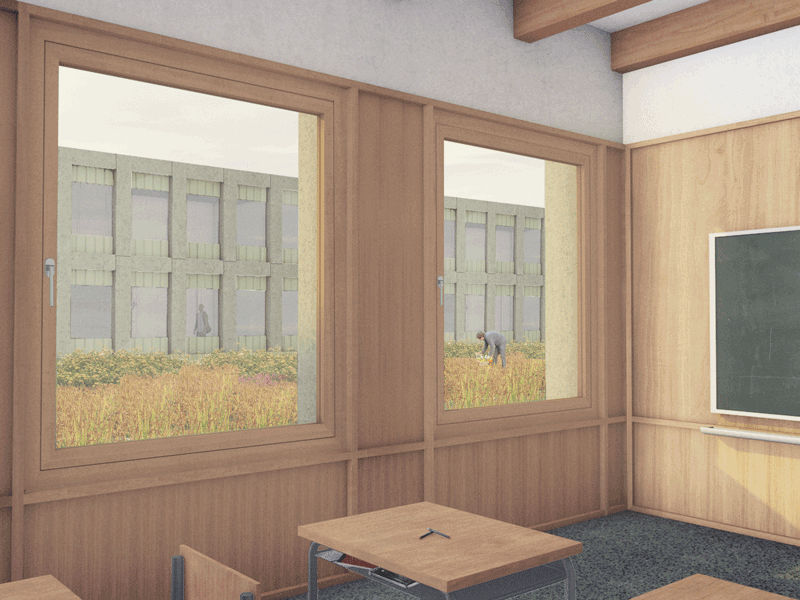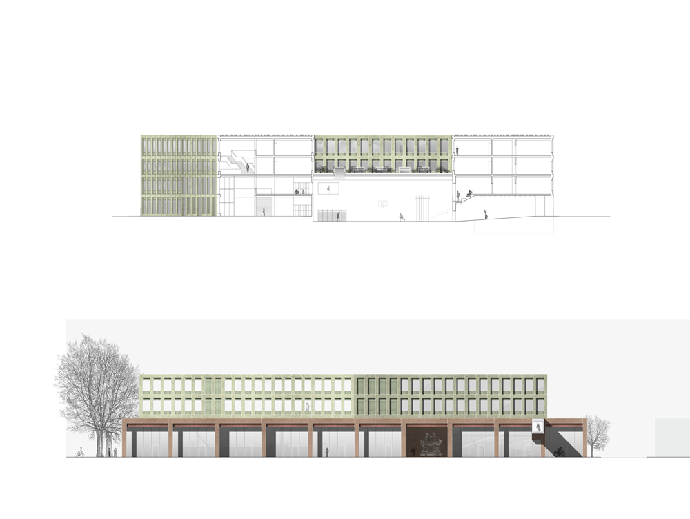 A l’image du château, le projet propose un volume regroupant l’ensemble des activités scolaire autour d’une cour/jardin suspendu, correspondant à la toiture de la salle de sport. Comme quatre tours, la distribution verticale est flanquée aux quatre angles de la salle de gymnastique. Dans le but de répondre au problème du bruit venant de la rue de l’Arsenal, le volume qui se développe autour de la cour/jardin, profite du silence de cette dernière. Le front de rue étant occupé par la distribution verticale principale.
